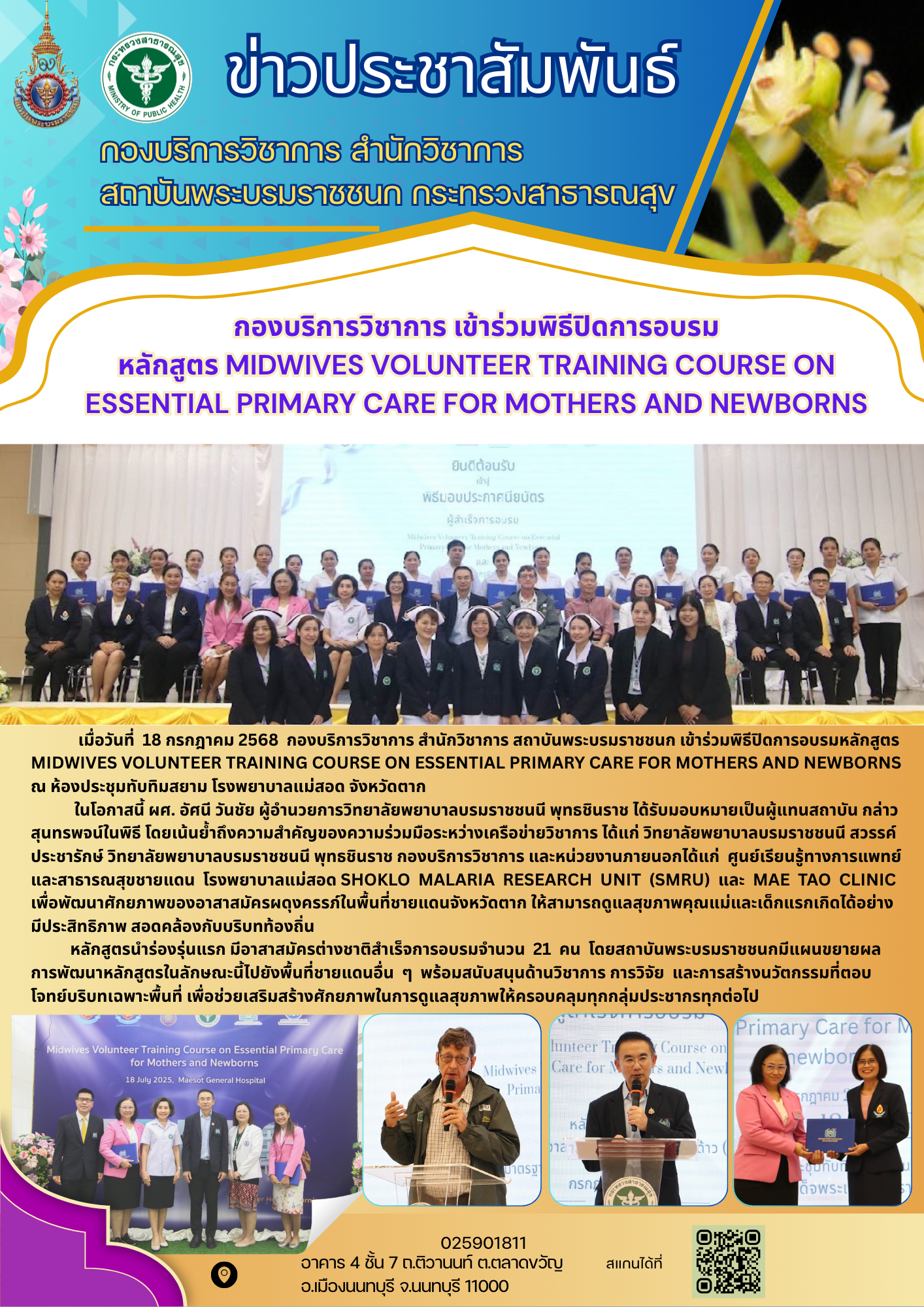 กองบริการวิชาการ เข้าร่วมพิธีปิดการอบรมหลักสูตร Midwives volunteer training course on essential primary care for mothers and newborns