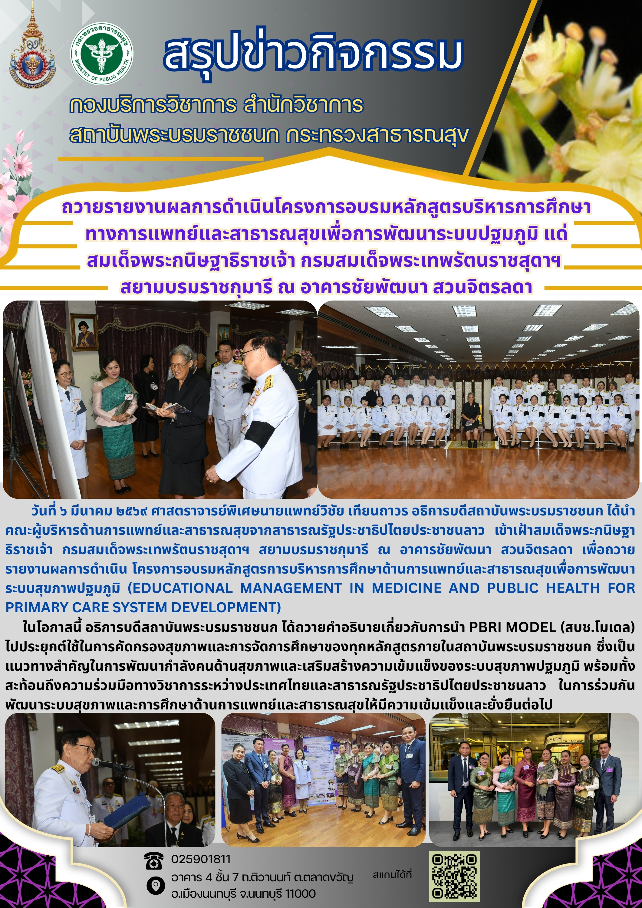 ถวายรายงานผลการดำเนินโครงการอบรมหลักสูตรบริหารการศึกษาทางการแพทย์และสาธารณสุขเพื่อการพัฒนาระบบปฐมภูมิ แด่สมเด็จพระกนิษฐาธิราชเจ้า กรมสมเด็จพระเทพรัตนราชสุดาฯสยามบรมราชกุมารี ณ อาคารชัยพัฒนา สวนจิตรลดา