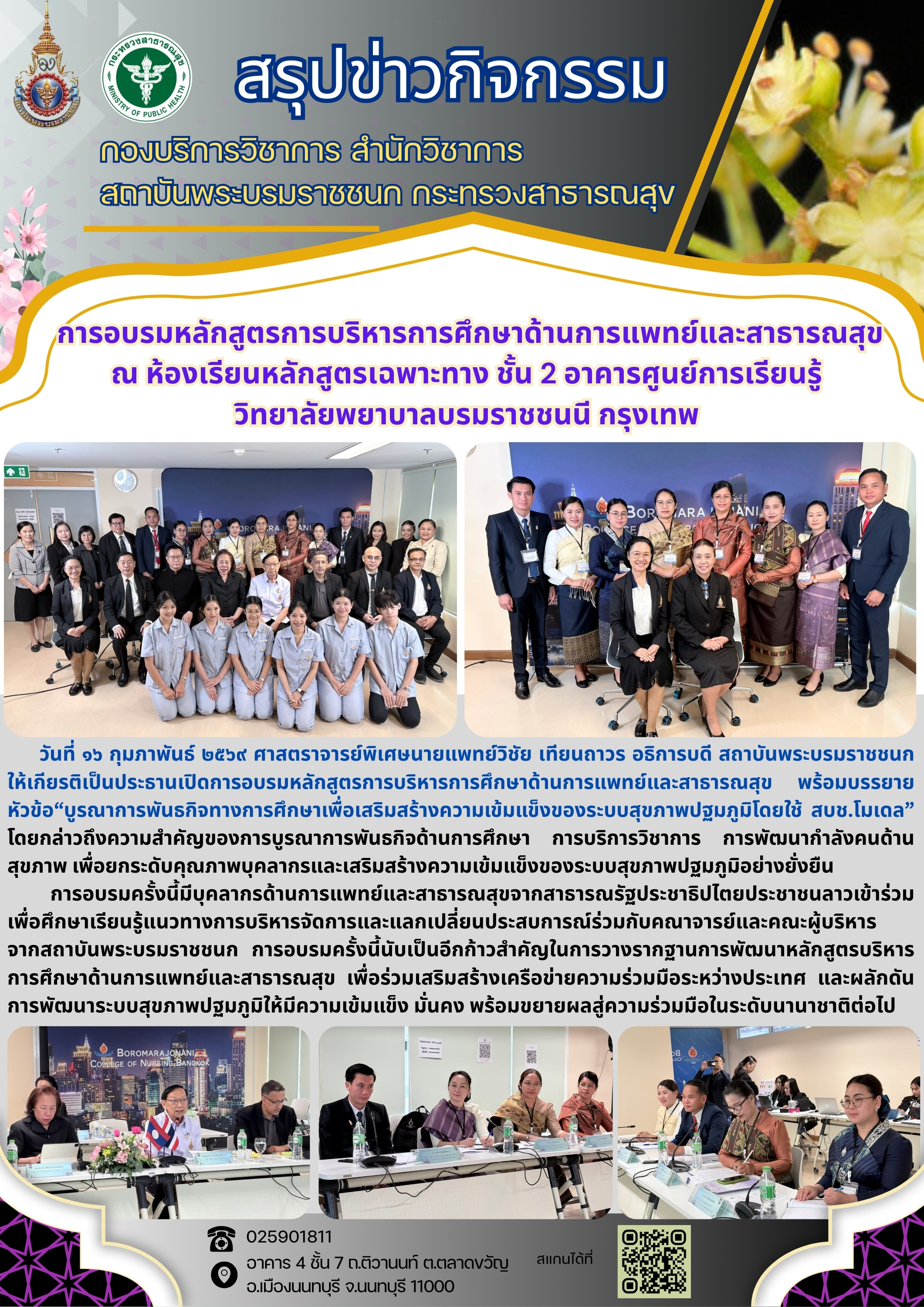 การอบรมหลักสูตรการบริหารการศึกษาด้านการแพทย์และสาธารณสุข ณ ห้องเรียนหลักสูตรเฉพาะทาง ชั้น 2 อาคารศูนย์การเรียนรู้ วิทยาลัยพยาบาลบรมราชชนนี กรุงเทพ